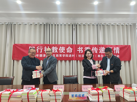為了拓展德清縣村社區居民閱讀的深度和廣度,引導全社會多讀書、讀好書,著力提高村民思想道德素質和科學文化素質。11月1日上午,德清縣教育局、新市鎮政府、德清縣社區學院、新市成校的領導和老師來到了新市鎮厚皋村和谷門村,開展了“踐行社教使命 書香傳遞真情”贈書活動,同時也為新市成校提供了心理健康方面的書籍。本次活動所贈書籍由德清縣社區教育學院提供。
