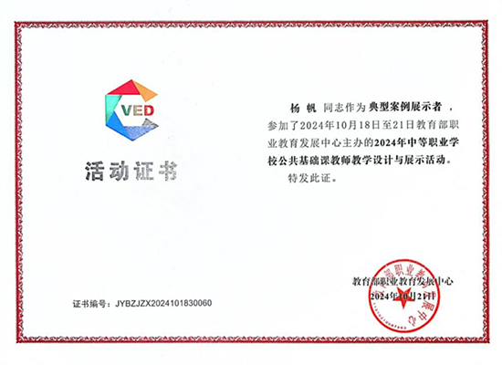 厚積薄發(fā),篤行致遠(yuǎn)。10月19日,由教育部職業(yè)教育發(fā)展中心主辦的2024年全國中等職業(yè)學(xué)校公共基礎(chǔ)教師教學(xué)設(shè)計與展示活動在西安圓滿結(jié)束。柳市職業(yè)技術(shù)學(xué)校楊帆老師歷經(jīng)多輪激烈選拔,憑借其卓越的教學(xué)能力和出色的表現(xiàn),在體育與健康組中脫穎而出,榮獲全國一等獎。并作為浙江省唯一代表,在活動中進(jìn)行了精彩的案例展示,其參賽作品成功入選全國中等職業(yè)學(xué)校教師教學(xué)設(shè)計典型示范性案例,將由高教社出版,向全國推廣。