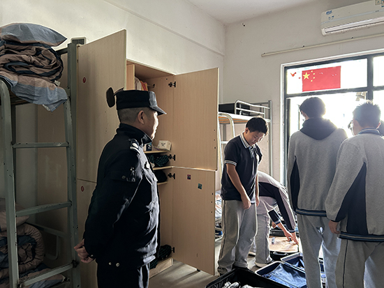 “請排好隊,以寢室為單位等待檢查”“請把箱子、衣柜門打開”,11月7日下午,諸暨技師學(xué)院安管處聯(lián)合諸暨市城東派出所對學(xué)生寢室開展了管制刀具等違禁物品突擊檢查。
