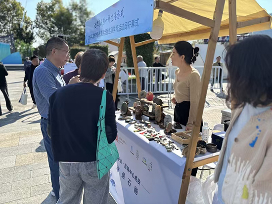 在活動現場,昌碩成校石畫班特聘教師、非遺傳承人施娟云以石頭為媒介,用色彩斑斕的顏料勾勒出一幅幅精致的石畫作品,引來了絡繹不絕的觀眾駐足觀賞。這項源自古代的技藝不僅考驗藝術家的手工精細度,更需要深厚的文化底蘊與創意靈感。不少觀眾被吸引上前,圍著老師認真學習繪畫技法,甚至有人在老師指導下拿起畫筆,嘗試在小小的石頭上留下自己獨特的印記,體驗了一次跨越時空的對話。