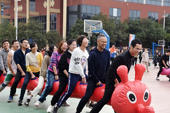 此次趣味運動會設有乒乓球擲準、投飛鏢、套圈、立定跳遠、1分鐘夾彈珠等個人項目,以及心心相應(背夾球接力賽)、拔河、快樂毛毛蟲等集體項目,既有趣味性又有挑戰(zhàn)性,既有益智性又有健身性,既要發(fā)揮個人實力又考驗團隊配合。特別是集體項目比賽中,教職工分為5個學院展開爭奪,各參賽隊伍積極組織,配合默契,場上奮勇爭先,場下歡呼鼓勁,賽場上吶喊聲、歡笑聲交織成一片。