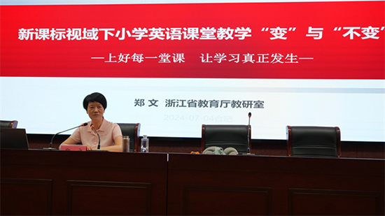 浙江省教育廳教研室小學英語教研員鄭文帶來《新課標視域下小學英語課堂教學的“變”與“不變”》的講座,她指出:變的是新課標,新理念,新教材;不變的是需時刻關注學生學習興趣的培養(yǎng),良好學習習慣的養(yǎng)成和學習方法的習得。結合具體案例“Chant和Spell”部分的教學,分析了新教材的變化。同時,指導一線教師將省編《課堂作業(yè)本》與單元主題聯(lián)結,更好地運用到課堂活動中去。湖州市小學英語教研員吳悅分享講座《新教材 新課堂——基于單元整體的小學英語課堂教學新實踐》,她首先聚焦新教材的設計編排,從教材的結構編排、體例變化、設計亮點這三方面全面解讀了新教材的新看點,然后從教育理念、課時內(nèi)容、詞匯句子、主題設置等方面的變化來詳細解讀新舊教材的對比。兩位專家對新教材的解讀及教學建議讓老師們明晰了教學方向,為保證和提升小學英語教學質(zhì)量提供了有力的支撐。