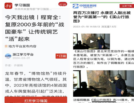 近年來,程育全屢登“永康春晚—華溪春潮”舞臺、多次被央視《探索·發現》《中國影像方志》《五金之光》《愛奇藝.守藝人》等眾多媒體作為“中國五金之都”傳統工藝的形象代言人宣傳報道,展現“中國五金之都”金屬技藝獨特的文化魅力。他主演的《第三只眼看永康—匠心永康》視頻,經央視國際在線向全球發布,閱覽量已達4700多萬。其技藝與事跡,近期就有6次登上《學習強國》宣傳報道。