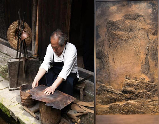 創新工藝代表作有:溪山行旅、萬壑松風、抬頭見喜、山水永康等藝術山水銅畫,其中《溪山行旅》榮獲2023年第三屆中國工藝美術博覽會“百花杯”金獎,被業界譽為“中國山水銅畫第一人”。