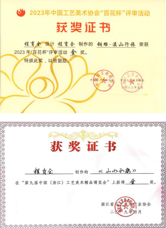 程育全16歲起跟隨父親學藝打銅,24歲與父親一起從家庭作坊起步到創辦神雕公司,傳承并熟練掌握與使用鑄、鍛、鏨、雕、刻、鏤、嵌、鑲、貼金、泥金、彩繪、高溫氧化等20多種傳統工藝,創新發明有噴銅工藝、鐫鏨銅工藝、潑雕銅工藝、多維鏨雕銅工藝、錘銅畫工藝等多項新工藝新技術。他的《溪山行旅》《松鶴延年》等山水銅畫,技藝獨特,自成一派,被業界譽于“中國山水銅畫第一人”。他的作品榮獲國家級、省市級等各類獎項100多項,多件作品被各級博覽館收藏,他是銅藝行業的領軍人物。