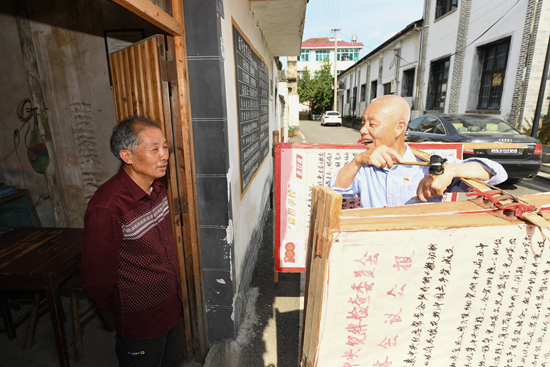行走鄉間的“扁擔學校”打通了農村終身學習服務的最后一公里。截至目前,“扁擔學校”已開展大小宣講2500多場,制作宣講板報400余期、超過了20萬字。一根扁擔挑起八塊展板,一路隨處走、隨時講,走遍了潛川鎮的16個行政村,甚至還去過桐廬、富陽等地開展宣講,讓黨的政策方針深入到尋常百姓的心里。