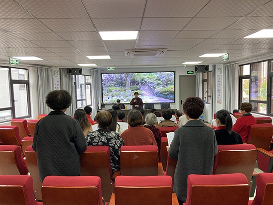 課堂中,任老師用通俗易懂的語言講授了越劇的唱腔特點等基本戲曲知識,并以最基礎的“吸氣”“吐氣”拉開序幕,教唱了越劇《五女拜壽》選段。學員們一句句跟唱,一遍遍修正,加上有多媒體伴奏,現場學習氛圍十分熱烈。
