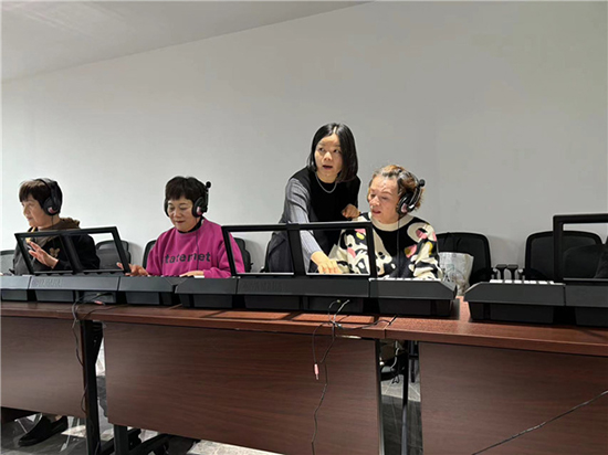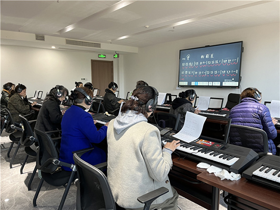 上午,學(xué)員們都早早地來到了會議室,學(xué)校老師已經(jīng)提前為學(xué)員準(zhǔn)備了電源、插排等活動物資。老師首先讓大家了解各種音符在琴鍵上的位置、指法,并耐心地教大家識譜唱譜,每位學(xué)員都帶著對樂器彈奏的熱情積極參與到活動中,輪到實(shí)操環(huán)節(jié),大家都很有秩序地輪流在電子琴上練習(xí)彈奏指法,對于個別學(xué)員老師會手把手地重新教導(dǎo)。此外,老師還現(xiàn)場選取歌曲進(jìn)行演繹分析,指導(dǎo)一部分有基礎(chǔ)的學(xué)員演奏技巧,同時講解如何配好伴奏,整個培訓(xùn)室回蕩著美妙的音樂。