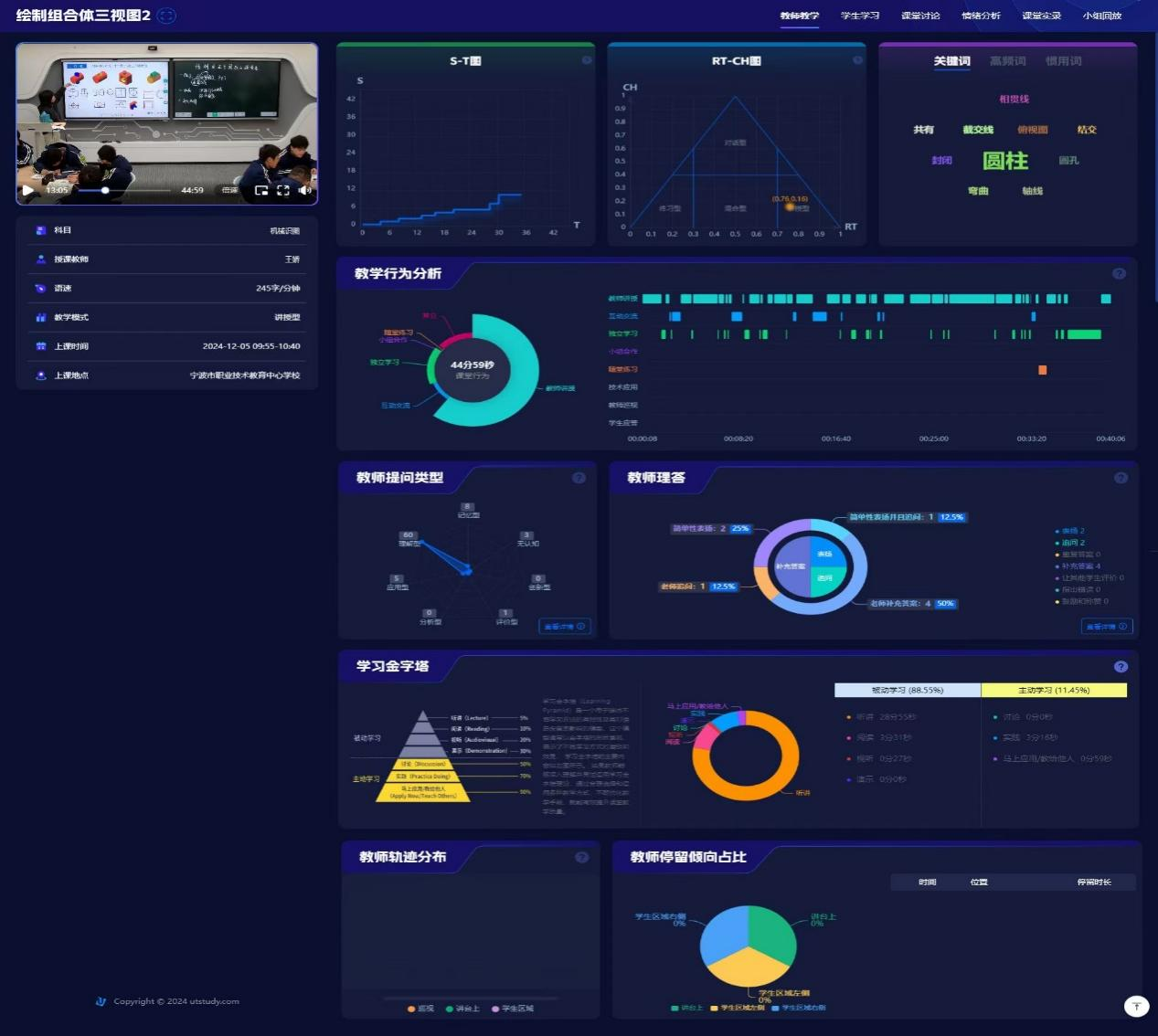 此次研修活動以兩場精彩的公開課開場,俞杰和王嬌兩位老師分別呈現了精彩的公開課展示。俞杰老師以“繪制組合體三視圖”為課題,通過直觀的模型展示和細致的步驟講解,引導學生深入理解并掌握繪制組合體三視圖的技巧。王嬌老師則以“繪制兩正交圓柱相貫線”為課題,巧妙地將理論與實踐相結合,指引學生對知識點進行歸納總結,使學生在實踐中學習到了復雜的幾何知識,兩位老師的教學風格各具特色。課后,參與活動的教師們圍繞授課教師的教學設計、課堂教學過程及教學效果紛紛發表了精彩的點評。本次課程采用的是省編的中高職一體化改革新教材,兩位老師的教學基本功扎實,知識講解清晰到位,得到了評課老師的一致肯定。在評課環節中,基于教學行為大數據的分析輔助結合聽評課專家的意見,在肯定兩位老師教學亮點的同時,也指出了教師的講授時間過多的問題,建議在未來的教學中更多地引導學生自主學習和探索,以培養學生的創新思維和實踐能力。最后評課老師們表示,中高職一體化改革是今后職業教育發展的導向,本次公開課采用新的中高職一體化改革教材進行教學,是一種很有意義的嘗試,同時,大數據分析系統的輔助評課,讓評課更加精準,也能幫助授課老師不斷優化教學設計,精進課堂教學。