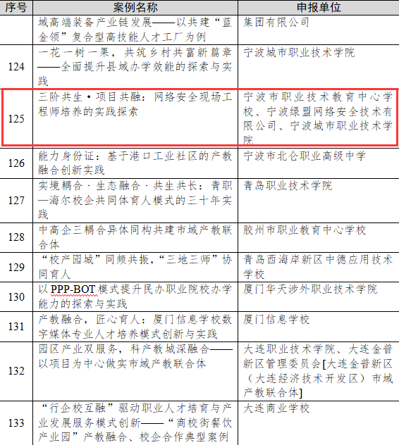 近日,教育部網站公示2024年產教融合、校企合作典型案例遴選結果,寧波市職業技術教育中心學校、寧波綠盟網絡安全技術有限公司、寧波城市職業技術學院共同申報的網絡安全育人案例榜上有名。這一榮譽的獲得標志著學校在網絡安全現場工程師培養的創新實踐得到了國家級的認可與肯定。
