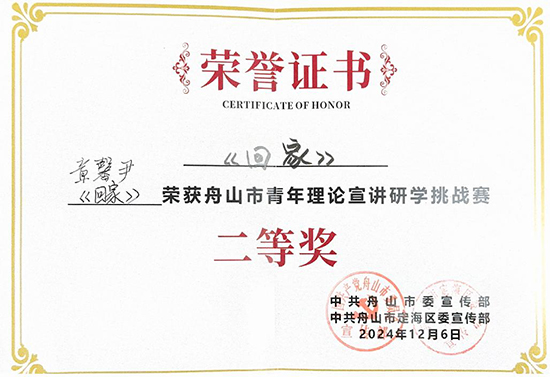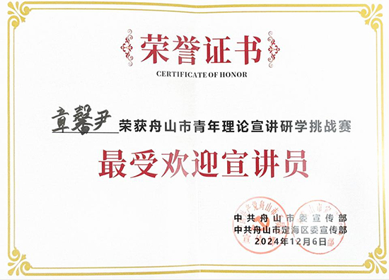 12月6日下午,舟山市青年理論宣講研學(xué)挑戰(zhàn)賽決賽在定海區(qū)干石覽鎮(zhèn)新建村鄰里中心舉行。舟山職業(yè)技術(shù)學(xué)校(舟山技師學(xué)院)青年宣講員章馨尹所在團(tuán)隊(duì)最終獲得二等獎,其本人獲評“最受歡迎宣講員”。