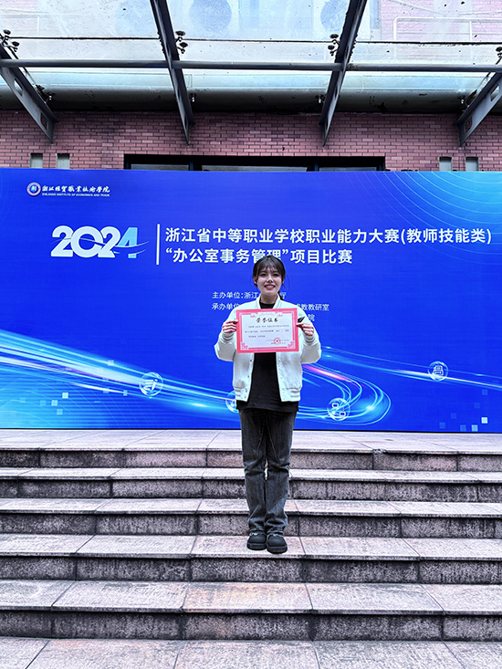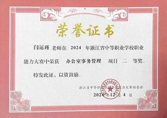 近日,浙江省中等職業學校職業能力大賽(教師技能類)“辦公室事務管理”項目比賽在浙江經貿職業技術學院(杭州)圓滿落下帷幕。臨平商貿職高商務助理專業閆運瑾老師與來自省內10個市17所職校的參賽教師們同臺角逐,最終獲得二等獎!