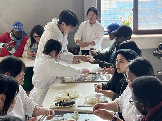 在烹飪專業學生的指導下,留學生們興致勃勃地投入到了中國傳統美食蒸團、湯圓和餃子的制作過程中。他們認真揉搓面團、包餡料,仿佛一場美食魔法正悄然展開。不一會兒,形態各異的餃子在留學生們的巧手下誕生,透露出傳統美食的獨特魅力,他們紛紛露出滿足的笑容。