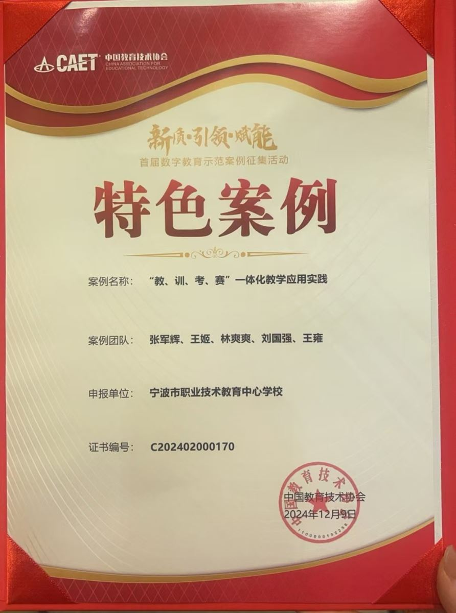 近日,寧波市職業(yè)技術(shù)教育中心學(xué)校在由中國教育技術(shù)協(xié)會主辦的首屆數(shù)字教育示范案例征集活動中,報送的《“教、訓(xùn)、考、賽”一體化教學(xué)應(yīng)用實踐》案例榮獲特色案例獎。這一榮譽(yù)標(biāo)志著學(xué)校在網(wǎng)絡(luò)安全現(xiàn)場工程師培養(yǎng)方面的創(chuàng)新實踐得到了廣泛認(rèn)可。