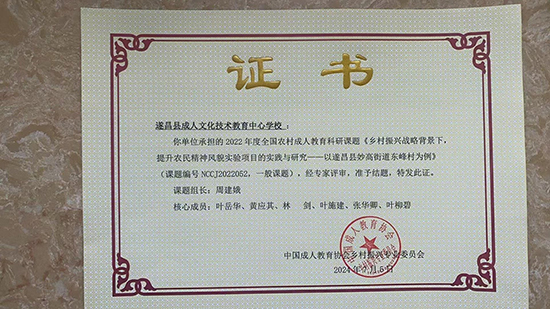 近日,遂昌中心成技校周建娥主持在2022年4月立項的全國農村成人教育科研規劃課題《鄉村振興戰略背景下,提升農民精神風貌實驗項目的實踐與研究——以遂昌縣妙高街道東峰村為例》,通過2年實踐研究,經中國成人教育協會農村成人教育專業委員會組織專家評審,已成功結題。