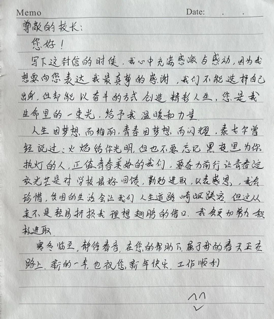 周一清晨,陽光如往常一樣灑進永康市職業技術學校校長室。在辦公桌上,靜靜地躺著兩封信。信中的文字如潺潺暖流:“您的到來,如同春日暖陽,照亮我心田。我會銘記教誨,努力學習,不辜負學校的期望。”寥寥數語,卻是兩顆被愛與溫暖照亮的心靈,向教育者的無私奉獻發出的最誠摯、最高的贊譽!
