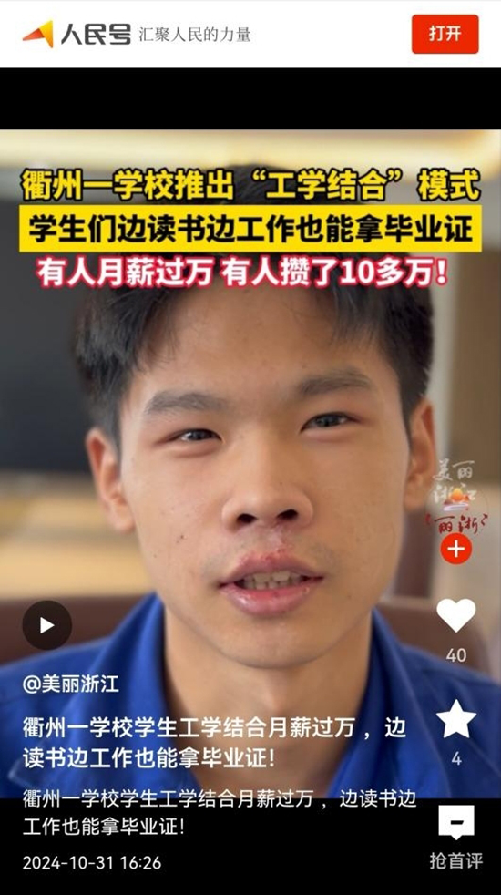 近日,潮新聞發(fā)布的《衢州這所學(xué)校“工學(xué)結(jié)合”模式結(jié)出碩果,學(xué)生邊讀書邊工作,月薪過萬》火爆全網(wǎng),上了熱搜,《人民日?qǐng)?bào)》、新華網(wǎng)等十多家媒體爭相轉(zhuǎn)發(fā),評(píng)論點(diǎn)贊超百萬,主媒體閱讀量及派生播放量已經(jīng)過億,絕大多數(shù)都在贊美浙江、贊美衢州、贊美企業(yè)、贊美學(xué)校、贊美這種培養(yǎng)人才的模式,各路專家、博主也紛紛出來發(fā)言,認(rèn)為值得全國推廣。是何方神圣如此勁爆網(wǎng)民?網(wǎng)民熱捧的背后究竟有何等驚人的秘密?讓我們一起來看看江山高級(jí)技工學(xué)校推行“工學(xué)一體,雙元雙導(dǎo),德技雙馨”人才培養(yǎng)模式的前世今生。