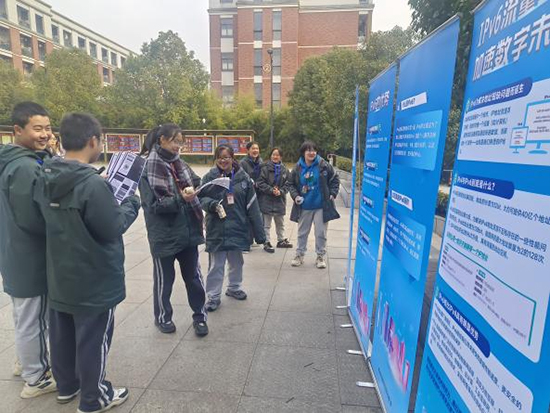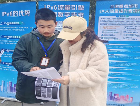 在食堂廣場,計算機專業學生面向來往的師生發放IPv6宣傳折頁,介紹國家IPv6規模部署和應用政策,普及IPv6基礎知識和技術優勢,說明IPv6在各行各業中的廣泛應有。來往的師生饒有興趣地駐足觀看,學習新技術,體會新應用,暢想新未來。在教師層面,老師們集中學習省市區下發的關于教育系統IPv6部署與應用工作的文件精神,觀看IPv6宣傳科普視頻,閱讀相關文字材料,感受IPv6的強大功能和產業應用,體會下一代互聯網與教育教學深度融合的未來發展新趨勢。