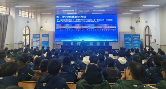 在學生層面,學校信息技術部李炎明部長以“IPv6,開啟萬物互聯新時代”為主題,面向計算機網絡技術專業200余名學生,開設了IPv6技術推廣和應用的專題培訓講座,系統梳理和回顧了IP地址的概念和作用,如何查看和設置IP地址,并著重講述了IPv6和IPv4的區別和聯系,說明IPv6地址表示方法、測試方式及使用優勢,拓展了手機移動端“淘寶、京東、美團、高德”等學生常用APP對IPv6技術的廣泛支持。隨后,計算機教研組長周美老師在實訓課上為同學們演示了IPv6地址的查看方式及使用方法,學生通過電腦實操實踐,進一步體驗并加深了IPv6地址的使用。通過深入淺出地理論講解,圖文并茂地展示說明、實時操作演示及上機實訓體驗,原來一知半解地IPv6書本知識變得生動活潑、清晰可見,IPv6從“長在深閨人不知”到“天下誰人不識君”,正走進人們的生產生活,帶來卓越的體驗。