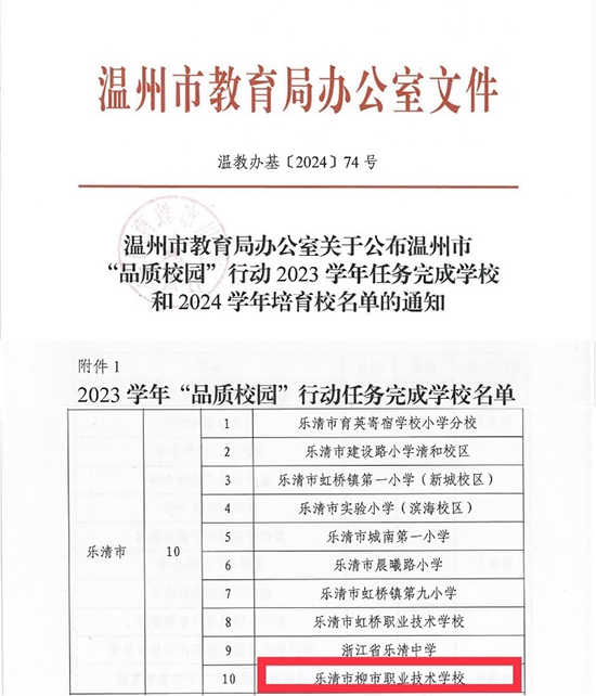 近日,溫州市教育局公布2023學年“品質校園”行動任務完成學校名單,樂清市柳市職業技術學校入選!這份榮譽,不僅是對學校過往教育成果的高度認可,更是對未來發展潛力的有力肯定。