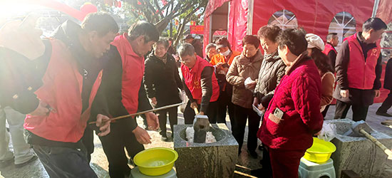 在搗年糕區域,熱氣騰騰的年糕香氣撲鼻,幾位身強力壯的居民手持石槌,在石臼里輪番上陣,有節奏地捶打著年糕。他們動作嫻熟有力,引來一旁的大人和孩子們目不轉睛地觀看。不多時,剛搗好的年糕便被居民們紛紛取走,包上精心準備的美味餡料,制成了當地特色的“糖糕奶”。大家品嘗著這熱乎乎的美食,臉上洋溢著幸福的笑容,整個社區都沉浸在濃濃的年味中。