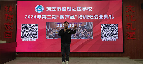 12 月 13 日晚,瑞安市錦湖社區(qū)學(xué)校文化禮堂內(nèi)華燈璀璨,一場(chǎng)洋溢著民族風(fēng)情與藝術(shù)魅力的葫蘆絲演奏會(huì)在此精彩上演,為觀眾帶來了一場(chǎng)難忘的音樂盛宴。此次演奏會(huì)作為第二期葫蘆絲培訓(xùn)班的結(jié)業(yè)演出,不僅是學(xué)員們學(xué)習(xí)成果的集中展示,更是他們?cè)诤J絲藝術(shù)之路上的一次重要里程碑。