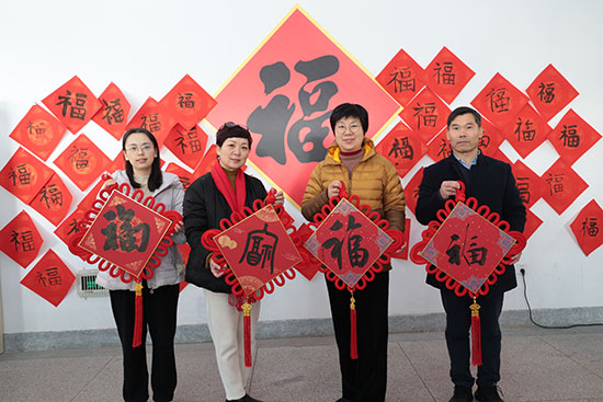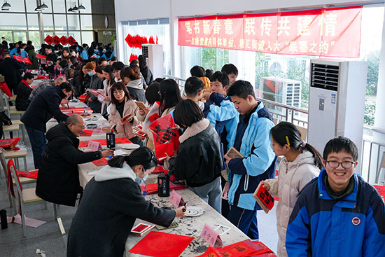 校黨委書記范曉春與硯邊歲月書法社骨干成員徐新奇、鄭強勝、蔣雪揚、許韜等共同參與,特邀學校黨建共同體單位嘉興大學建工學院黨委書記童勇軍以及國家級工藝美術大師童人杰,省書協(xié)會員柴林根、江軍和塘匯街道人大工委主任張玨一行來校,共同參與寫福送春聯(lián)活動,現場洋溢著一派其樂融融、福氣滿滿的祥和氛圍。