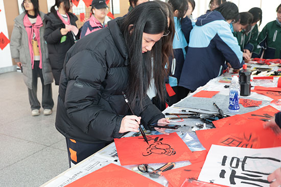 參與活動的師生們也躍躍欲試,參照字帖,手握毛筆,在紅紙上盡情揮毫。筆鋒游走,墨香四溢,一個個或青澀稚嫩、或圓潤可愛的“福”字躍然紙上,飽含著大家對新春的美好祈愿。