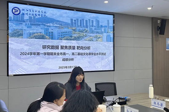 在會(huì)議第二項(xiàng)議程,浙江信息工程學(xué)校副校長(zhǎng)陸婷結(jié)合本校實(shí)際,對(duì)2024學(xué)年第一學(xué)期期末全市高一、高二基礎(chǔ)文化課學(xué)業(yè)水平測(cè)試情況進(jìn)行了詳細(xì)分析匯報(bào)。陸婷從本校統(tǒng)測(cè)整體情況、各年級(jí)不同類型班級(jí)語(yǔ)數(shù)英三科的整體情況、典型分析等多個(gè)維度進(jìn)行數(shù)據(jù)研究、靶向分析,充分挖掘出在班級(jí)、學(xué)科、教師、學(xué)生各個(gè)層面在數(shù)據(jù)背后隱藏的問題,并針對(duì)性地提出下階段提升教學(xué)質(zhì)量的重點(diǎn)工作舉措,明確將協(xié)同教研組、專業(yè)部、班主任與任課教師推進(jìn)各項(xiàng)舉措的落實(shí)。