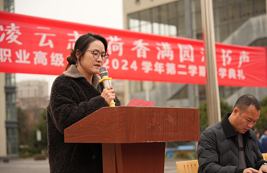 教師代表馬華芬老師上臺(tái)發(fā)言。馬老師從教以來工作勤懇踏實(shí),曾獲區(qū)優(yōu)秀班主任,區(qū)骨干班主任等榮譽(yù),她分享了自己“荷文化育人”的感悟,講述了動(dòng)人的師生故事,勉勵(lì)同學(xué)們要既有凌云之志,亦存務(wù)實(shí)之心,在課堂的沃土中深扎根系,于實(shí)踐的天地間舒展新芽。