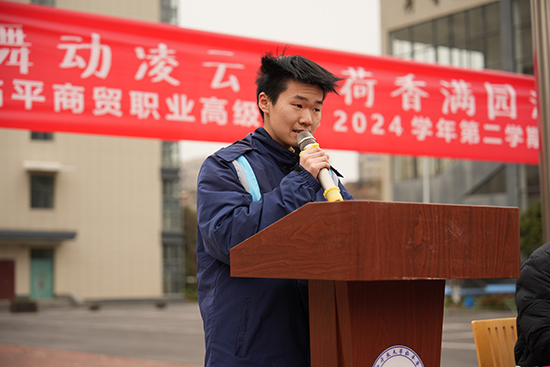 金融231金正屹同學(xué)代表全體學(xué)生講話。金正屹同學(xué)暢談新學(xué)期的“荷韻蛇志”,分享了自己的學(xué)習(xí)故事、備賽經(jīng)歷和人生理想,號(hào)召同學(xué)們要掌握科學(xué)方法,養(yǎng)成良好習(xí)慣,堅(jiān)定目標(biāo)前行,分秒必爭(zhēng),不負(fù)春光。
