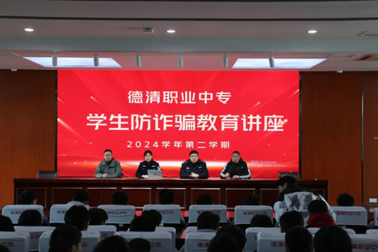 2月28日上午,德清職業(yè)中專邀請了武康派出所副所長、學(xué)校法制副校長沈家昀與德清縣公安局反詐中心的警官來校開展學(xué)生防詐騙教育講座。校黨委委員馬紀(jì)孝出席,機電專業(yè)、服裝專業(yè)等200多名學(xué)生參加。講座由政教處處長鄧志民主持。
