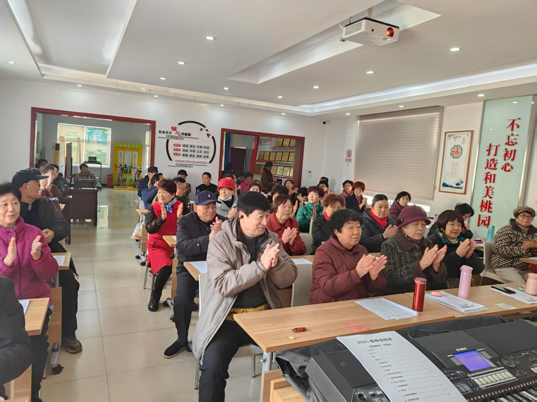 簡短而又充滿儀式感的開班活動后,宋雪東老師給聲樂班學(xué)員上新學(xué)期第一課。他帶領(lǐng)大家發(fā)聲練習(xí)后,邊彈琴邊教大家學(xué)唱新曲《永遠(yuǎn)的贊歌》,大家學(xué)得不亦樂乎!新加入的學(xué)員周德勇說:“我去年年底剛退休,今年能在家門口上老年聲樂班,重拾年輕時的愛好,昨晚激動得半夜都沒睡著!”