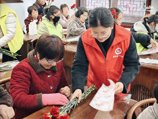 活動現(xiàn)場,26位特殊女性在志愿者指導(dǎo)下學(xué)習(xí)花材修剪、色彩搭配與造型設(shè)計技巧。康乃馨、向日葵與滿天星在巧手編織下漸成繽紛花束,花香與歡笑充盈整個空間。78歲的獨居老人張阿姨捧著作品感慨:“沒想到這輩子還能親手扎這么漂亮的花,心里暖洋洋的。”
