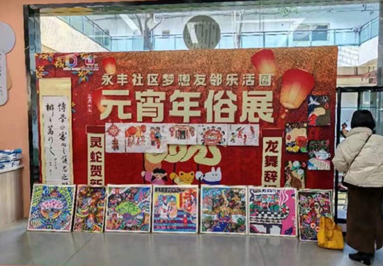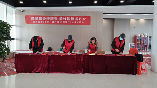 書(shū)畫(huà)創(chuàng)作班龔國(guó)銘老師和學(xué)員們?cè)阽娷そ值懒愎な袌?chǎng)等地為環(huán)衛(wèi)工人和社區(qū)群眾寫(xiě)春聯(lián)送福字,共計(jì)送福字120個(gè)、春聯(lián)60對(duì),并和學(xué)員鐘志鴻為西林寺社區(qū)布置迎春書(shū)畫(huà)展,共展出書(shū)畫(huà)作品9幅。一幅幅寓意吉祥的春聯(lián)和“福”字在行云流水間新鮮出爐,將濃濃的年味和溫暖傳遞到每一位群眾的心中。