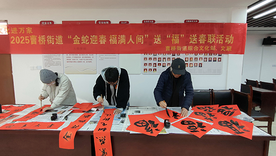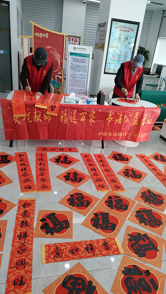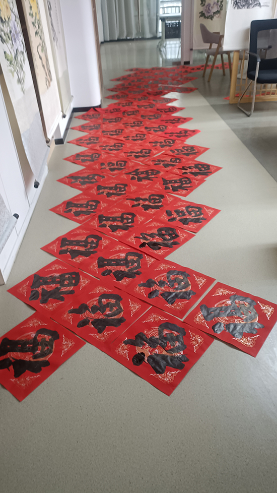 書(shū)法班龔國(guó)銘老師帶領(lǐng)鐘志鴻、何鑫華等學(xué)員在新春佳節(jié)即將來(lái)臨之際,先后參加機(jī)關(guān)、團(tuán)體、街道、社區(qū)、學(xué)校、銀行、村莊、企業(yè)等送春聯(lián)、送福字、送溫暖活動(dòng)。據(jù)不完全統(tǒng)計(jì),參與場(chǎng)次50多場(chǎng),寫(xiě)春聯(lián)3000多對(duì)、福字6000多個(gè)、年歷軸220軸,為市民朋友送去了濃濃的年味和新年的祝福,也營(yíng)造了歡樂(lè)祥和的節(jié)日氛圍。
