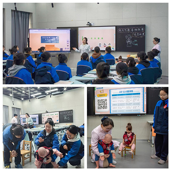 第三個議程為公開課交流展示研討,由諸暨市職教中心的張艷老師與紹興護士學校的石佳茹老師攜手合作,共同聚焦氣道異物阻塞這一高發的意外場景。兩位老師緊密圍繞教學標準中關于掌握預防與規范處理幼兒常見意外傷害及其他突發事件的知識與技能要求,展開了深入的教學實踐。她們創新采用“虛實結合+雙師協同”的教學模式,有效破解了教學難點。通過虛擬仿真平臺進行交互式急救流程的預演、借助海姆立克急救馬甲進行輔助練習,使急救效果可視化;在雙師共導的模式下,實現了“醫育融合”的教學理念,將醫療急救與幼兒保育緊密結合。此外,老師們還將“生命至上,急救有方”的理念融入課堂,深厚了學生的職業情懷。課堂效果顯著,獲得了廣泛好評。