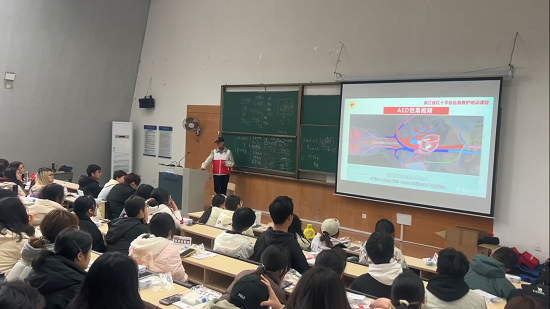 課堂上,浙江省紅十字一級應急救護師丁柏偉憑借其扎實的專業知識與豐富的教學經驗,以生動幽默的語言風格迅速吸引了全場學生的注意力。他借助精心制作的PPT,將心肺復蘇這一專業性較強的急救知識,深入淺出地展現在大家眼前。