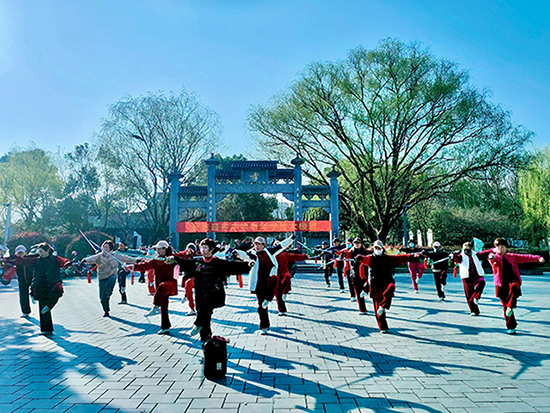 孝子公園綠意盎然的環境為課程增添獨特意趣。在晨光中舞劍,劍光與樹影交錯,構成一幅動靜相宜的養生畫卷。薛建萍介紹,戶外教學能讓學員更好地感受“天人合一”的太極理念,公園的開闊空間也利于動作舒展。課程還融入中醫經絡知識,講解太極劍對肩頸、腰腿的保健作用,激發學員長期堅持的動力。