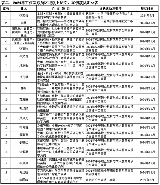 2024年,工作室在教科研領(lǐng)域取得了豐碩成果。通過組織系列教育科研講座與工作坊,工作室成員積極探索班級(jí)管理的新理念、新方法,將科研成果轉(zhuǎn)化為實(shí)踐。這一年,工作室成員主持課題、撰寫論文,獲得省市級(jí)以上教學(xué)成果獎(jiǎng)5項(xiàng)、教育規(guī)劃課題4項(xiàng)、職業(yè)教育改革案例4篇,并在公開刊物發(fā)表論文14篇。這些成果不僅提升了班主任的教育科研能力,也為班級(jí)管理注入了新的活力。此外,學(xué)校舉辦了多場(chǎng)班主任個(gè)人比賽,涵蓋班級(jí)管理方案設(shè)計(jì)、主題班會(huì)課展示、育人故事等多個(gè)方面。工作室成員唐淑菁老師在富陽區(qū)中小學(xué)班主任主題班會(huì)大賽中榮獲三等獎(jiǎng),周一妹老師在富陽區(qū)班主任基本功大賽中斬獲“班級(jí)活動(dòng)策劃”和“管理育人案例”模塊一等獎(jiǎng),并榮獲綜合二等獎(jiǎng)。周一妹、牧?xí)约t兩位老師更是在全國(guó)中等職業(yè)學(xué)校教師教學(xué)設(shè)計(jì)與展示活動(dòng)中分別獲得一等獎(jiǎng)和二等獎(jiǎng),充分展現(xiàn)了班主任隊(duì)伍的風(fēng)采與實(shí)力。