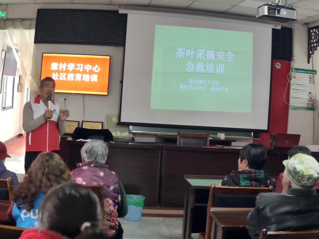 3月20日上午,安吉縣章村鎮紅十字會、普康養老和章村學習中心在章村村文化禮堂組織開展茶農安全生產急救培訓,特邀章村鎮紅十字會會員方炳熙老師授課,91名茶農帶著竹簍與筆記本齊聚一堂,學習采茶季必備安全技能。