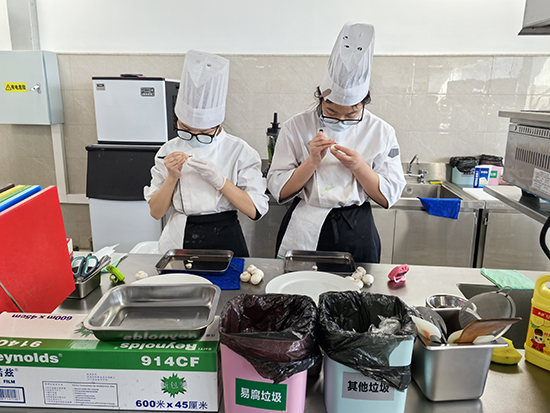 自接到參賽通知起,該校西式烹飪團隊的莫琳和羅莎莎同學,中式烹飪團隊的沈以欣、劉云鵬和韓思源同學在教練團隊的帶領下,開啟了緊張有序的備賽訓練。全體隊員和指導教師始終保持高度責任感與精益求精的態度,從清晨到深夜,全身心投入到高強度訓練中。訓練期間,每個環節都力求極致:原料選擇、工藝設計、單一模塊打磨以及整體搭配協調性均融入創新元素,將傳統與現代完美結合。“中式烹飪”尤其注重刀工精細度、火候掌控力及擺盤美感,經過反復推敲與打磨,確保每道菜品展現最佳狀態。指導教師全程陪伴,不僅提供技術指導,還在心理上給予鼓勵支持,并通過全真模擬比賽幫助學生適應節奏與環境,提升實戰能力。
