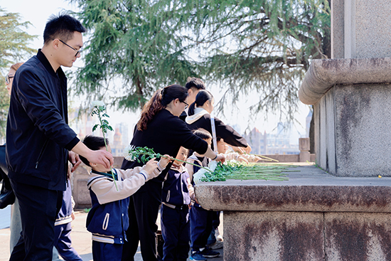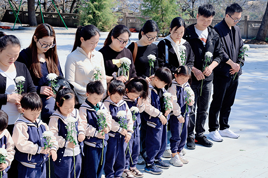 上午9時,全體家庭手持小菊花列隊(duì)肅立。家委會代表向孩子們講述紀(jì)念碑象征意義后,全體人員面朝紀(jì)念碑深深三鞠躬,并低頭默哀一分鐘。春風(fēng)輕拂過孩子們手中的花束,稚嫩的眉眼間透出難得的莊重。“英雄們的故事就像星星一樣亮晶晶的”,家委會成員用童趣比喻詮釋默哀意義,孩子們似懂非懂地點(diǎn)頭,小手緊緊攥著家長衣角。緊接著,親子家庭手牽手緩步繞行紀(jì)念碑。孩子們用指尖觸摸碑體鐫刻的歲月痕跡,將精心準(zhǔn)備的菊花輕放碑前。朵朵白菊,將抽象的愛國情懷轉(zhuǎn)化為可觸可感的成長體驗(yàn)。它不僅寄托著對先烈的哀思,更在孩子們心中勾勒出責(zé)任與傳承的雛形。