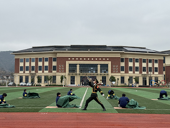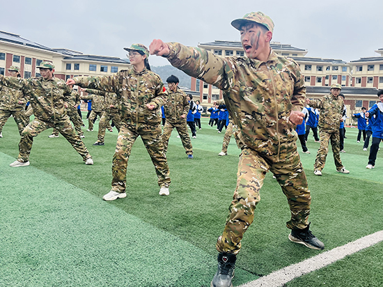 隨后,學生們組成整齊方陣,以伐矯健有力的步伐,響亮的口號,彰顯青春蓬勃朝氣與團結協作精神,展現校園軍事化管理對紀律性和團隊意識的有效培育。緊接著軍體拳展示中,同學們動作剛勁有力、整齊劃一,喊聲震天,充分展現出堅韌不拔的意志和過硬軍事素養。