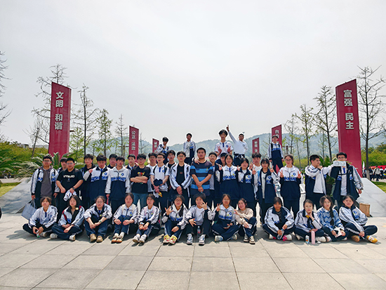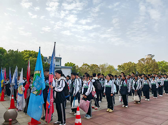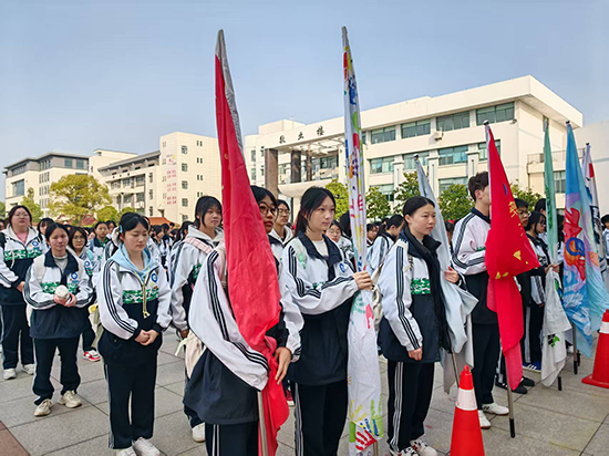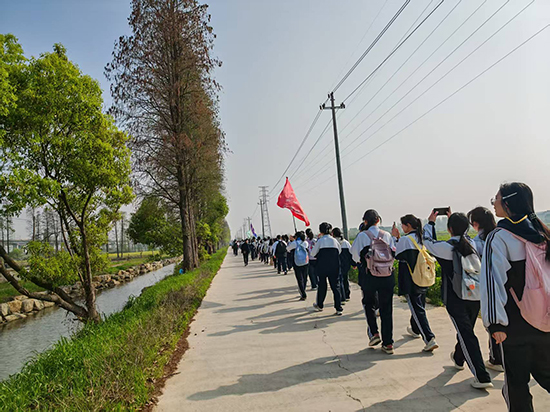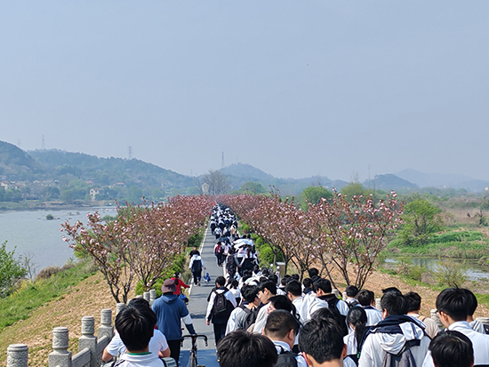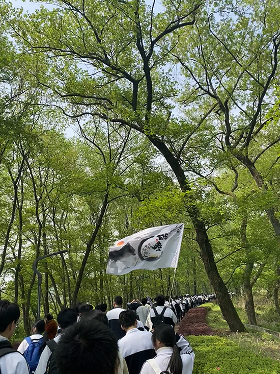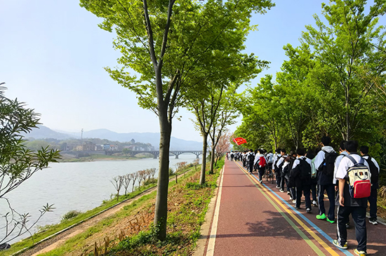 7時50分,文化廣場上口號嘹亮、旌旗獵獵。全體師生佩戴好青春毅行徽章,列成方陣整裝待發。校長吳曉彩在出征儀式上激情開講:“今天我們用腳步丈量家鄉熱土,用汗水澆灌青春理想。希望同學們在行走中讀懂江山發展的脈動,在堅持中淬煉新時代青年的擔當!”隨著“出發”令下,3000多名師生分三個團有序開拔,一面面班旗引領著蜿蜒的隊伍,如長龍般向著目標挺進。