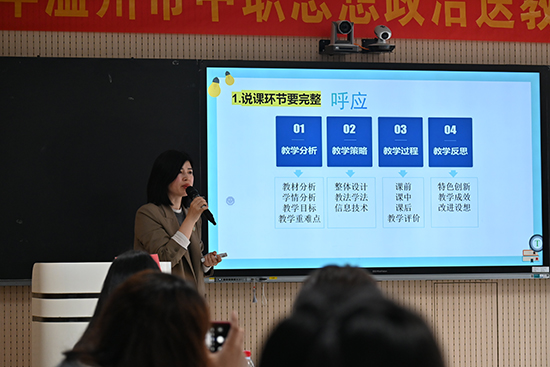 說課展示與經驗分享環節同樣精彩紛呈。溫二職的陳彥芷老師圍繞“以賽促學,聚沙成塔”主題,展開說課,概述經驗;溫職專的王嘉以老師則以“‘青’舟無懼萬重山” 為主題,進行說課并分享經驗。兩位老師憑借自身深厚的教學積淀與豐富閱歷,毫無保留地分享了說課的精妙技巧、獨到心得。他們的分享如同一束束強光,為在場教師照亮了新的教學路徑,帶來了啟發性的教學新思路。