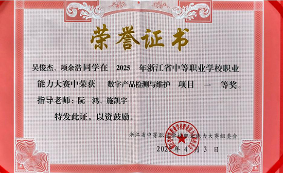 在剛剛結(jié)束的2025年浙江省中等職業(yè)學校職業(yè)能力大賽“數(shù)字產(chǎn)品檢測與維護”項目賽項中,由杭州閑林職業(yè)高級中學22電子大專吳俊杰同學和24級網(wǎng)絡安防班項余浩同學組成的隊伍(指導老師團隊:阮鴻、施凱宇、金峰、陳迪龍),經(jīng)過4個小時的激烈競爭,最終以總分第一的成績獲得該項目的第一名。
