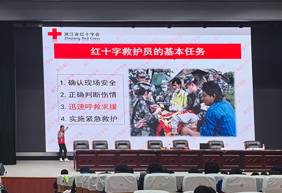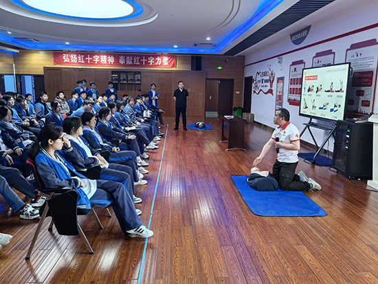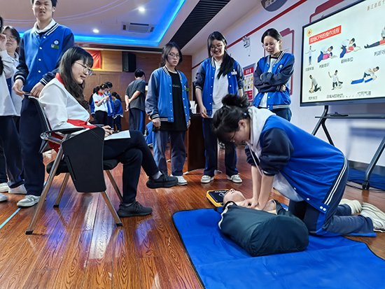 培訓過程中,區紅十字會領導、專家團隊以沉浸式教學為學生細心講解了心肺復蘇術(CPR)的黃金四分鐘法則、自動體外除顫器(AED)的智能語音引導系統以及海姆立克急救法的適用場景和標準化操作步驟等關鍵救護知識與技能。通過“理論講解+現場演示”的方式,讓學生們在模擬車禍、溺水等突發事件中,實現了從理論到實踐的思維跨越。在模擬場景里,學生們積極參與,親手操作,將所學理論知識運用到實際操作中,切實掌握了創傷急救的核心技能。