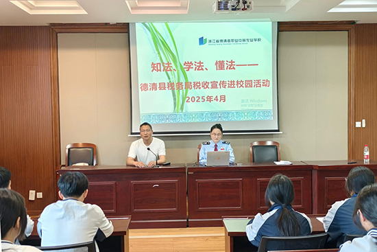 春意正濃四月天,稅宣普法好時節。4月16日,德清職業中專邀請國家稅務總局德清縣稅務局干部來校開展稅法宣傳活動,學校財會、電商專業的200多名學生參加,活動由政教處處長鄧志民主持。