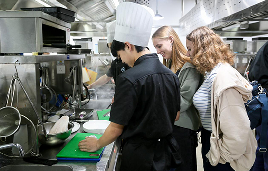 在隨后的參觀環節中,德國師生們深度體驗了學校的特色課程與文化:步入一樓展廳,工美專業學生創作的藝術作品以精巧的工藝與創意吸引眾人駐足;走進23西餐班的實訓課堂,同學們現場展示地道的西餐制作技藝,從食材處理到擺盤裝飾,盡顯匠心;于米塑非遺館內,師生們近距離感受傳統工藝的魅力,細膩逼真的米塑作品令人贊嘆不已;在甌菜研究所,大家還領略了傳統溫州特色年夜飯的獨特風味與文化內涵,沉浸式體驗了中國飲食文化的博大精深。